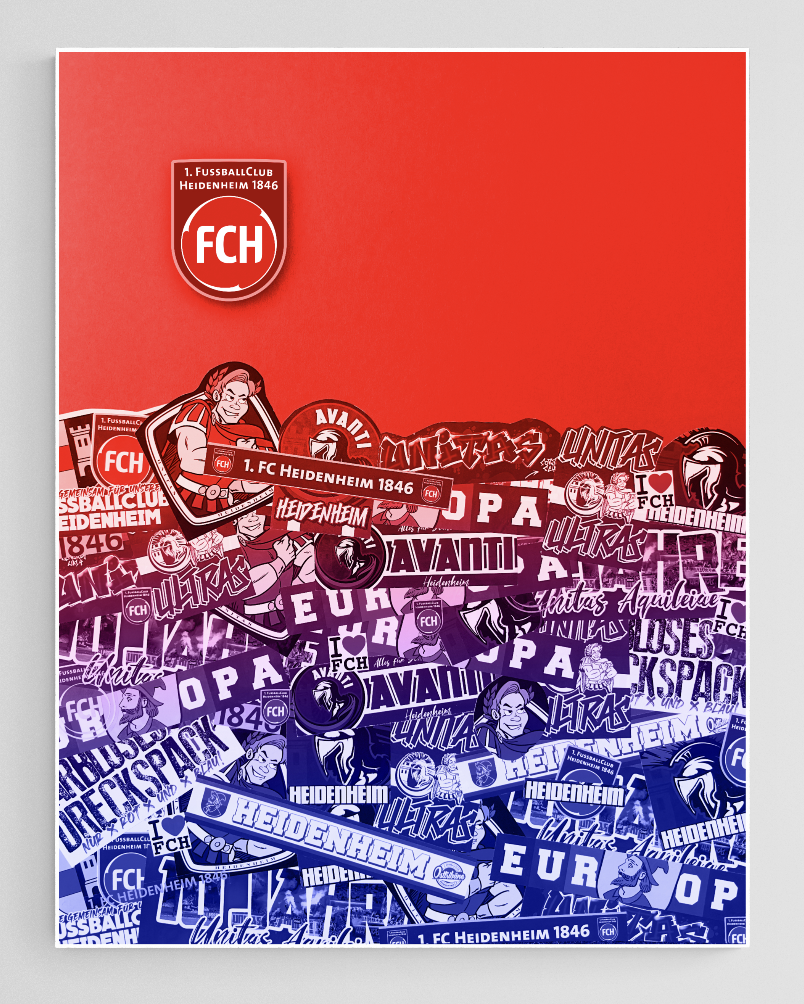 Diverse Fansticker auf farbigem Fotopapier gestickert, digitalisiert, 50 × 65cm, 5cm starker Alu-Galerierahmen Rahmen. Fuji Fotopapier ausbelichtet, hinter Acrylglas, gerahmt. Vereine auf Anfrage und Komission.
